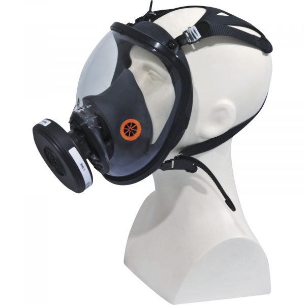 Máscara completa respiratoria de silicona ajustable con bandas. Ocular de policarbonato con campo de visión extra ancho (210°). Semimáscara interior de silicona para limitar el vaho y más confort (3 válvulas de inspiración, una válvula de exhalación, dispositivo fónico). Talla ajustable. Bandolera de transporte de máscara en reposo.