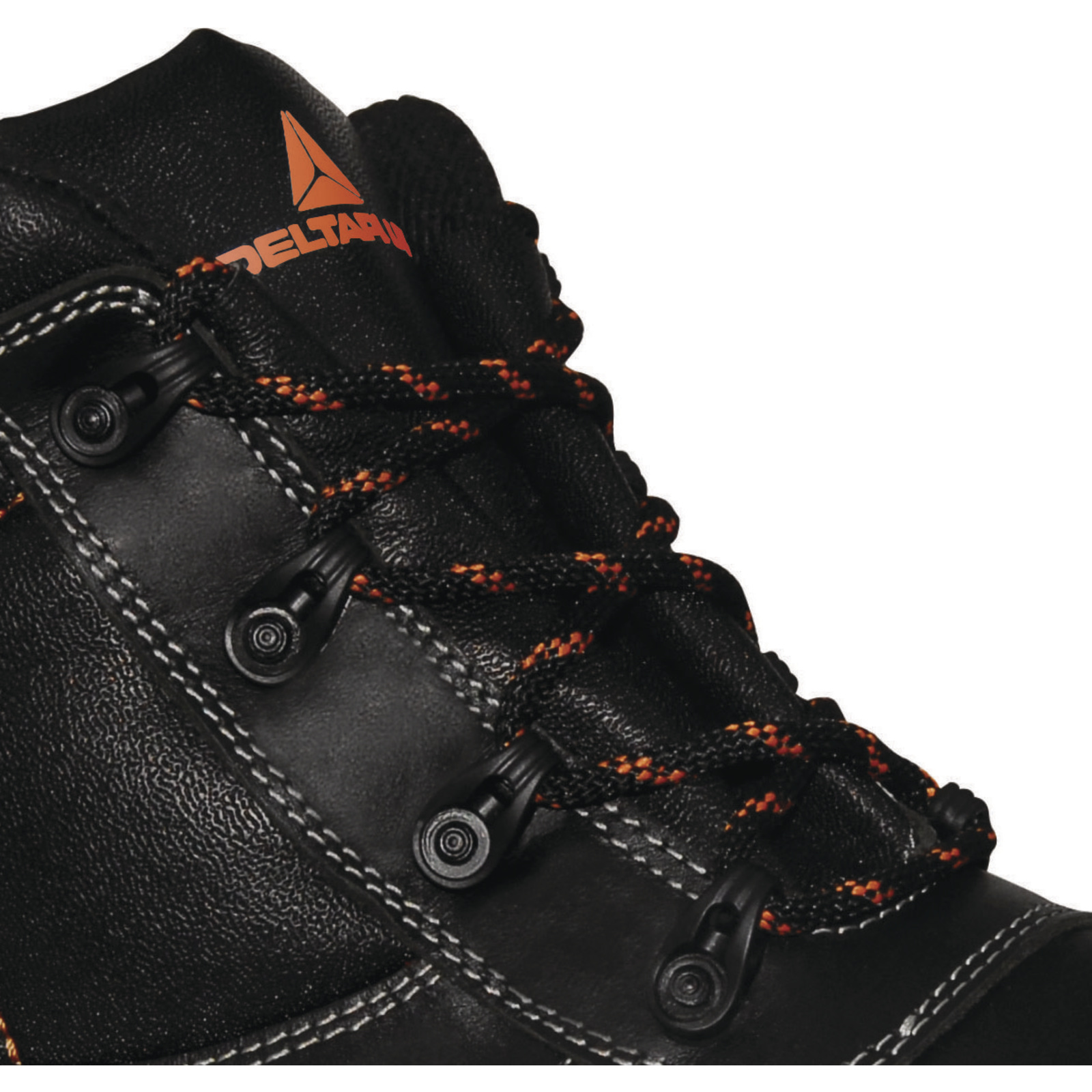 Caña : Piel crupón grabada, tratamiento impermeable S3. Forro: Malla Poliamida. Plantilla interior: Amovible preformada – Poliamida sobre EVA. Suela : Inyectada – PU bi-densidad. Calzado no magnético.